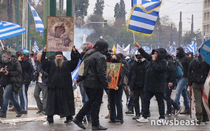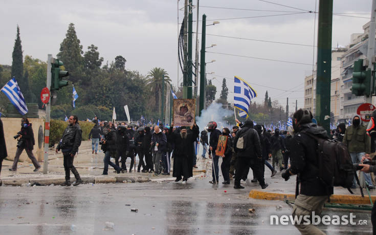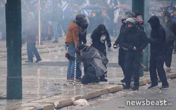 Για αρκετά λεπτά υπήρξαν συγκρούσεις, ενώ οι διαδηλωτές πέταξαν κόκκινες και άσπρες μπογιές στους αστυνομικούς.