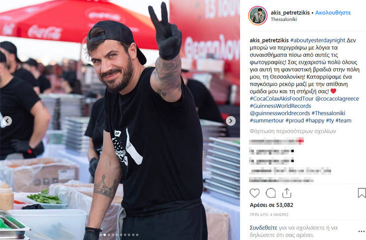 Τώρα, ήρθε η ώρα για τον πρώτο Έλληνα MasterChef να γνωρίσει ακόμη μία μεγάλη διάκριση και να δει τον εαυτό του στο βιβλίο των ρεκόρ Γκίνες. Κι αυτό διότι με την ομάδα του κατάφεραν να σπάσουν ένα παγκόσμιο ρεκόρ, ετοιμάζοντας 3.378 hamburgers με 9 στρώσεις σε μόλις μια ώρα. Το event έλαβε χώρα στην ιδιαίτερη πατρίδα του, τη Θεσσαλονίκη με τη συγκίνηση του Πετρετζίκη να είναι διπλή.