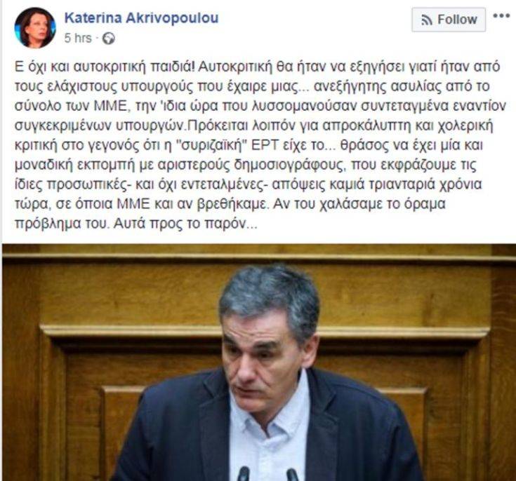 «Ε όχι και αυτοκριτική παιδιά! Αυτοκριτική θα ήταν να εξηγήσει γιατί ήταν από τους ελάχιστους υπουργούς που έχαιρε μιας… ανεξήγητης ασυλίας από το σύνολο των ΜΜΕ, την ίδια ώρα που λυσσομανούσαν συντεταγμένα εναντίον συγκεκριμένων υπουργών. Πρόκειται λοιπόν για απροκάλυπτη και χολερική κριτική στο γεγονός ότι η «συριζαϊκή» ΕΡΤ είχε το… θράσος να έχει μία και μοναδική εκπομπή με αριστερούς δημοσιογράφους, που εκφράζουμε τις ίδιες προσωπικές – και όχι εντεταλμένες – απόψεις καμιά τριανταριά χρόνια τώρα, σε όποια ΜΜΕ και αν βρεθήκαμε. Αν του χαλάσαμε το όραμα πρόβλημα του. Αυτά προς το παρόν…», έγραψε η Κατερίνα Ακριβοπούλου.