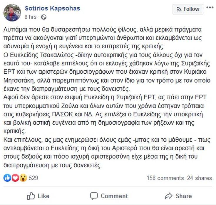 «Λυπάμαι που θα δυσαρεστήσω πολλούς φίλους, αλλά μερικά πράγματα πρέπει να ακούγονται γιατί υπερτιμώνται άνθρωποι και εκλαμβάνεται ως αδυναμία ή ενοχή η ευγένεια και το ευπρεπές της κριτικής. Ο Ευκλείδης Τσακαλώτος – δίκην αυτοκριτικής για τους άλλους όχι για τον εαυτό του – κατάλαβε επιτέλους ότι οι εκλογές χάθηκαν λόγω της Συριζαϊκής ΕΡΤ και των αριστερών δημοσιογράφων που έκαναν κριτική στον Κυριάκο Μητσοτάκη, αλλά παρεμπιπτόντως και στον ίδιο για τον τρόπο με τον οποίο έκανε την διαπραγμάτευση με τους δανειστές. Αφού δεν άρεσε στον ευφυή Ευκλείδη η Συριζαϊκή ΕΡΤ, ας πάει στην ΕΡΤ του υπερκομματικού Ζούλα και όλων αυτών που χρόνια έστηναν τρόπαια στις κυβερνήσεις ΠΑΣΟΚ και ΝΔ. Ας επιλέξει ο Ευκλείδης την υποκριτική και βολική αστική ευγένεια από τη δημοσιογραφία των ρήξεων και της κριτικής. Και επιτέλους, ας μας ενημερώσει όλους εμάς – μπας και το μάθουμε – πως αντιλαμβάνεται ο Ευκλείδης τη δική του Αριστερά που θα είναι αρεστή και στους δεξιούς και πόσο ισχυρή αριστεροσύνη είχε μέσα της η δική του διαπραγμάτευση με τους δανειστές», ανέφερε ο Σωτήρης Καψώχας.